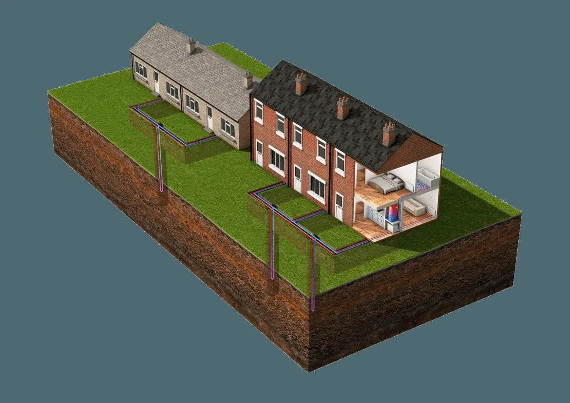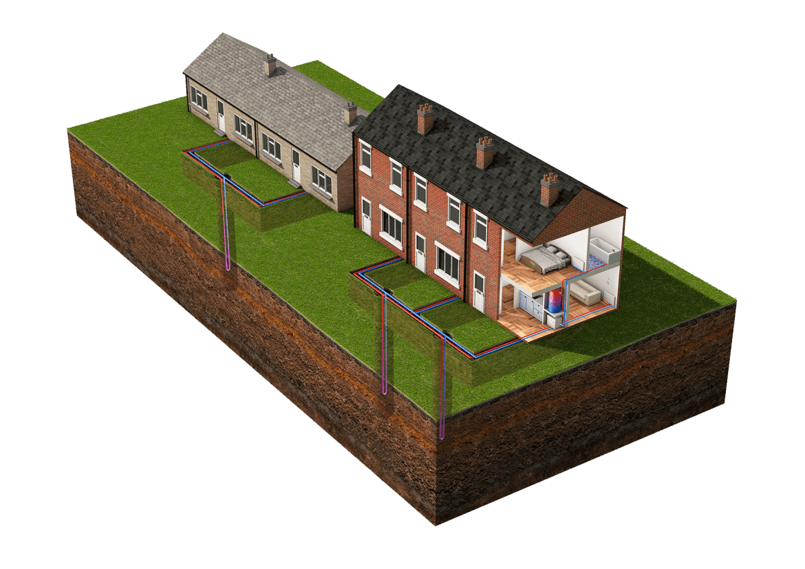 Typically one borehole is required per property. However, in Networked Heat Pump schemes, one deeper borehole could serve two properties, hence why they are referred to as a Shared Ground Loop Array.