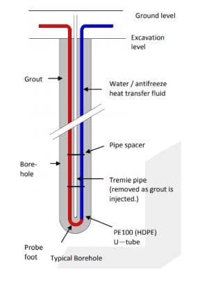 A single loop of pipe – usually PE100 HDPE or Pex pipe – is inserted into the borehole. Along with the borehole pipe, a small tremie pipe, which is about 25 to 40mm, is also attached to the borehole pipe.