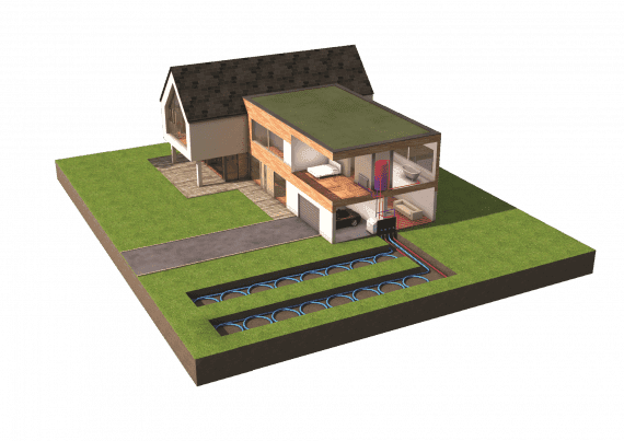 Slinkies or straight pipes collect heat from surface soil, about 1.2m below the ground. Maintaining a fairly constant temperature of 8-12°C all year round, the soil gains and replenishes most of its heat from solar energy.