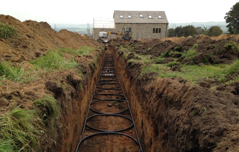 Straight pipes are laid in narrower trenches. Without the benefit of coils like the slinkies, straight pipes require more digging. To be precise, they require up to five times the length of digging compared to slinky pipes. Straight pipe trenches can be dug closer together than slinky trenches, but space for the spoil during excavation works will be limited.