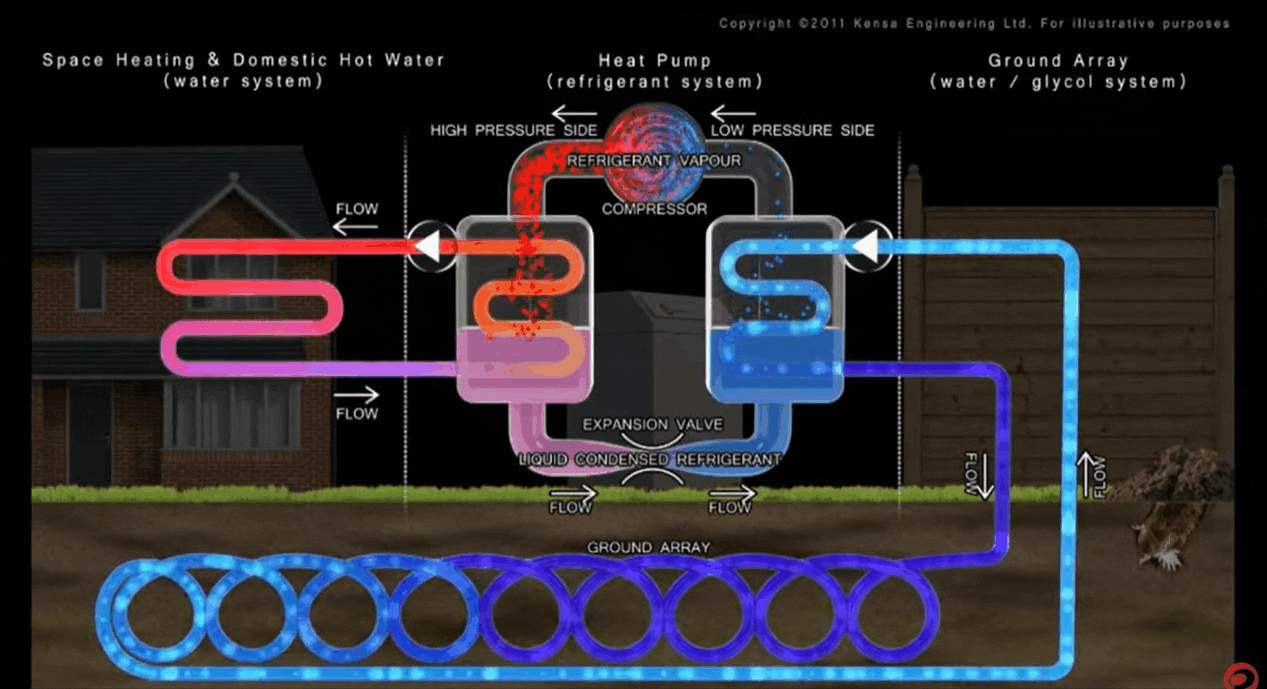 Having surrendered the absorbed energy from the ground to the heat pump, the fluid continues its circuit back to the submerged pipework to commence the cycle all over again.