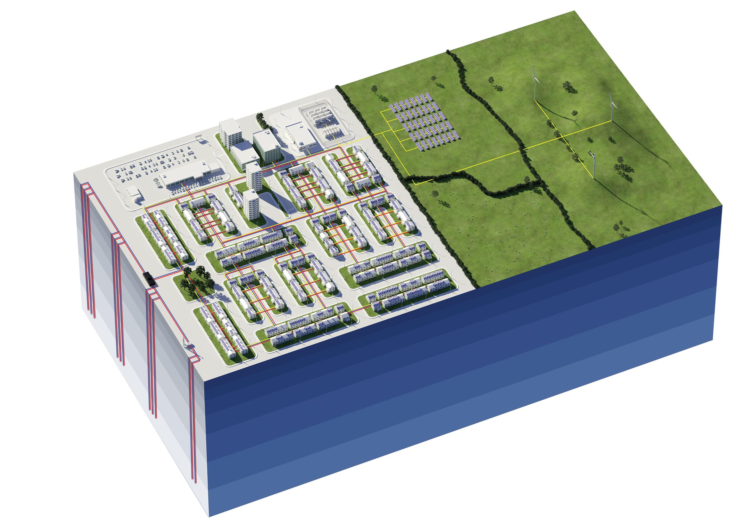 The system works year-round by absorbing renewable heat and delivering it to individual homes.
